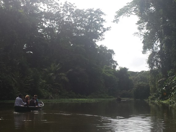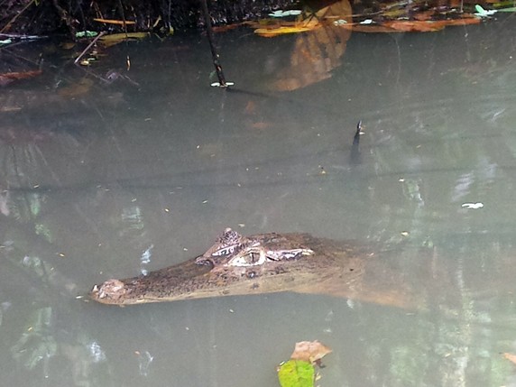 acceso al parque natural. Hay cuatro salidas, una cada dos horas empezando a las 6h de la mañana. El mejor turno es el primero, sin sol y coincidiendo con el despertar de los animales. En la Centro de la Asociación de Guías nos recoge Antonio, nuestro barquero y guía, quien remará durante todo el camino y nos dará información sobre la fauna y flora que vayamos viendo. El paseo dura 2h30 y transcurre en su mayor parte por canales menores cerrados al tráfico motorizado. Vemos basiliscos hembras y macho, cuatro caimanes, uno de ellos tras haber cazado una iguana que todavía lleva en la boca, aves diversas, tucanes pequeños, garzas, una tortuga jicotea, iguanas, monos aulladores, monos araña y alguna bestia más. El paseo es muy agradable y el ver fauna está garantizado, sobre todo si llevas un buen ojeador como Antonio.