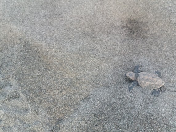 A eso de las cinco salimos a pasear por la playa, sabedores de que a esa hora empiezan a abrirse algunos nidos de tortugas, y las crías inician su camino hacia el mar. Bingo!!! En el sector de dentro del parque nos topamos con uno, hace un rato que ha comenzado, ya hay unos pocos turistas embobados con las graciosas tortuguitas. Las tortugas, dependiendo de la especie ponen entre 80 y 200 huevos. No sabemos cuánto tiempo llevan estas saliendo del nido, pero vemos las 30 o 40 últimas crías. La playa hace fácilmente 50 mts de ancho, las tortugas de apenas 5 centímetros emprenden una emocionante carrera llena de obstáculos. Cualquier socavón en la arena, una pisada humana, ramas, algas, restos de cocos y conchas, todo lo que encuentran a su paso es decenas de veces mayor que ellas, y parece que vayan ciegas chocando contra todo, pero siempre acaban encontrando un acceso dirección al mar. Cuando alcanzan la orilla deben adentrarse bien para que el mar las engulla, si las pilla a medio camino la ola las expulsa de nuevo. Una vez en el agua aún tienen que nadar 20 km para estar a salvo de depredadores. Solo un 2% de las tortugas lo consiguen, en este caso se debió de salvar el nido entero, seguramente la presencia de turistas ayudó a que los depredadores se mantuvieran alejados.