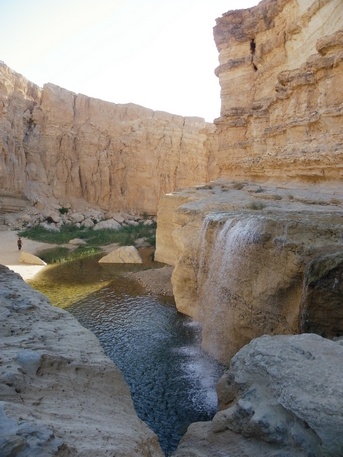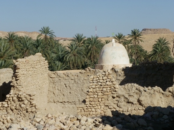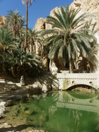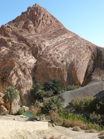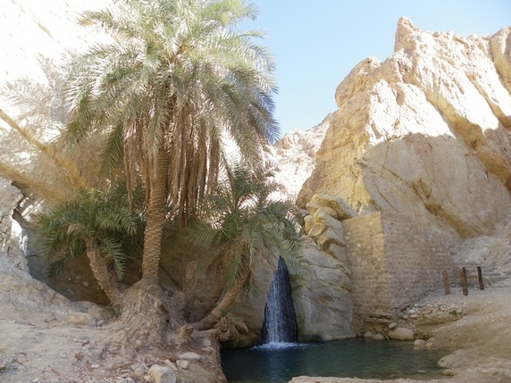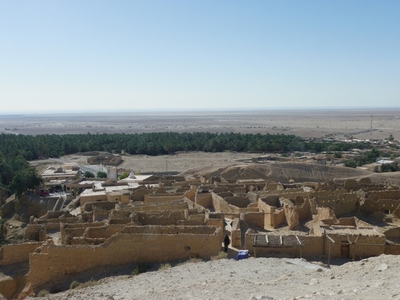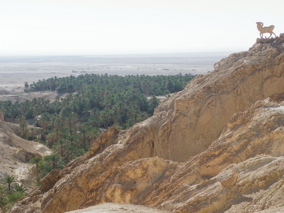 Chebikka es un pequeño pueblo de piedra y adobe en la ladera de una colina con vistas al lago salado de Chott el-Gharsa y el enorme palmeral que provee de agua al pueblo. Contratamos un guía por 5 TND. Nos muestra el antiguo modo de calculo para el reparto equitativo del agua, usando un reloj de arena y un par de tinajas colgadas de una cuerda. Colina arriba atravesamos el pueblo, tras 43 años de abandono las casas de piedra y adobe están en bastante mal estado, pero aun puede verse alguna puerta de madera de palmera. Las vistas del pueblo con el palmeral al fondo son increíbles. Al otro lado de la colina, tras un pequeño cañón, un manantial con un pequeño palmeral y una cascada alimenta una serie de pequeños arroyos subterráneos que abastece los pozos. Un sendero nos lleva de vuelta al aparcamiento, bar y tiendas de recuerdos. Dos orange juice 6 TND.