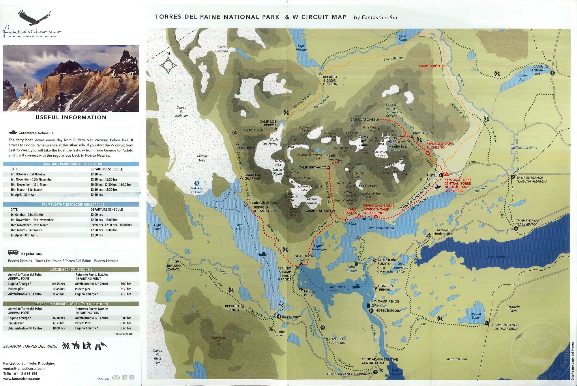 Vértice Patagonia, ambas con oficina en Puerto Natales. El coste del hospedaje con ropa de cama, desayuno y cena ronda los 125.000 CLP por persona y día. La otra opción es alquilar material de acampada en Puerto Natales, una tienda de campaña, dos sacos y dos colchonetas sale por 8.500 CLP la noche. Ninguna de las dos incluye transporte ni