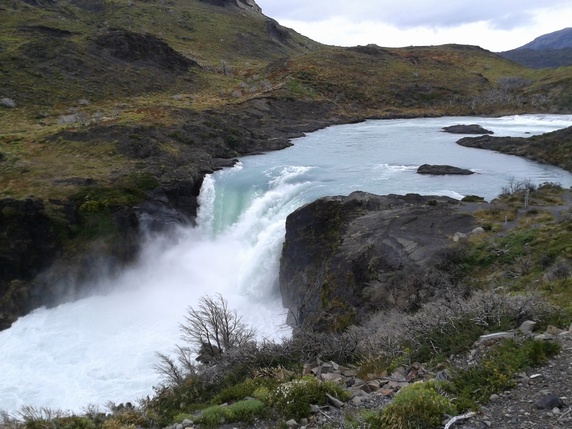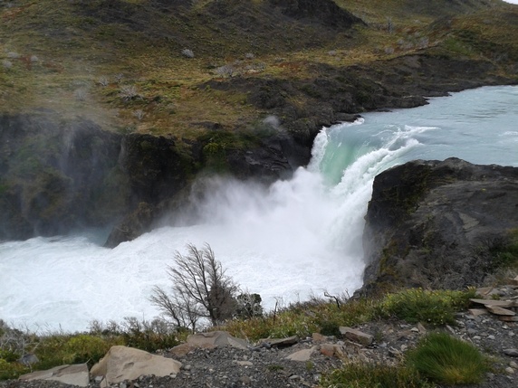 Salto Grande, unas cascadas de agua procedentes del lago Nordenskjold y que son transferidas al lago Pehoé. Cae mucha agua y con mucha fuerza, aunque no parece que haya mucha pendiente. Desde aquí también se deberían ver los cuernos del Paine pero sigue nublado. La tercera parada es para comer cerca del