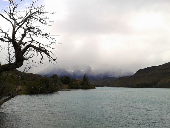 12:00 Tomamos el ferry catamarán que cruza el lago Pehoé. Tarda unos 45 minutos. No se puede subir a cubierta porque hace mucho viento y quedas completamente empapado en unos segundos. El