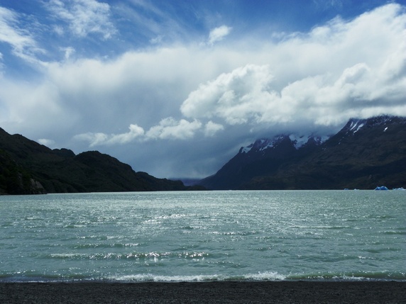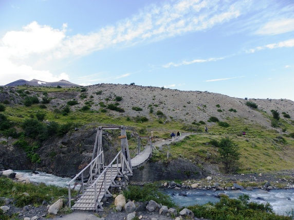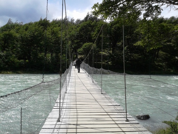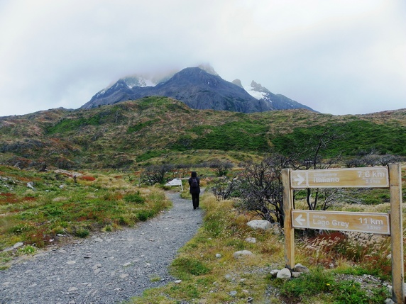 Hay una cafetería restaurante pero solo se puede comer con reserva. Nos conformamos con unos bocadillos de queso y salami que aun llevamos. La cuarta parada es junto a la Guardería Grey. Nos dejan una hora para hacer el camino que lleva hasta el lago Grey, pasando por un puente colgante. Al llegar al lago hay que caminar por la orilla un buen rato para empezar a ver el glaciar Grey frente a nosotros, a nada menos que 12 km de distancia. Se ven algunos icebergs en el lago. La quinta y última parada dentro del parque es en Portería Lago Sarmiento, última oportunidad de ver las Torres del Paine. Sigue nublado.