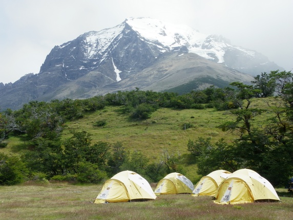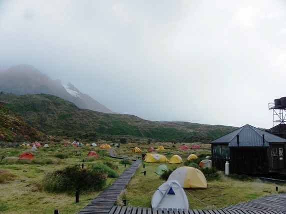 Paine Grande. Pagamos por acampar 4.000 CLP por persona. Está lloviendo, pero nos dicen que no hay previsión de que mejore así que nos ponemos a montar la tienda. El camping tiene una caseta con lavabos y duchas, y otra con cocinas y enchufes. Nos hacemos unos bocadillos de queso y salami en la cocina, super ruidosa y llena de gente, y nos vamos a caminar.