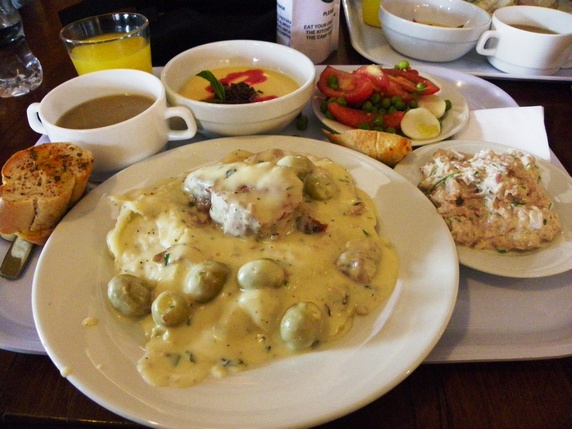 Torres (11.500 CLP) frente al camping, sopa, lomo con mostaza y macedonia de frutas. Cerveza Calafate Austral y una coca cola (4.500 CLP).
