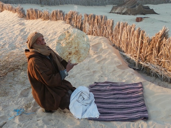 La cocina tunecina es muy similar a la magrebí, platos basados en verduras, carne vacuna, cordero, camello en el sur, o pescado en la costa, acompañados de cuscús o pasta. La salsa harissa es el condimento mas popular, preparado con guindilla molida y ajo, se sirve como aperitivo en un plato con aceite de oliva, aceitunas y pan baguette. Tabouna es el pan mas común en la calle, un pan redondo, plano y pesado, que recibe su nombre del horno circular de arcilla enterrado en el suelo con el que se hace. Una excursión al desierto permite probar el pan beréber, que los nómadas preparan enterrado en arena con unas brasas.