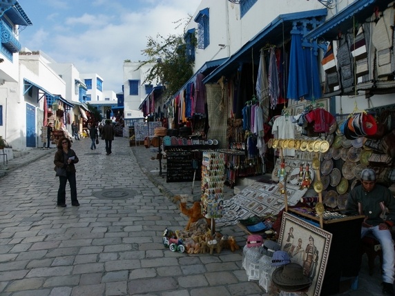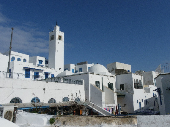 Sidi Bou Said, un bonito pueblo de calles adoquinadas repletas de flores y estrechos callejones encalados con casas de puertas y ventanas azules, donde acudían los residentes acomodados de Tunis en el siglo XIX huyendo del sofocante calor estival, y que hoy esta invadido por autocares de turistas. Desde el parking (2TND) la empinada calle principal, llena de galerías de artistas locales y tiendas de
