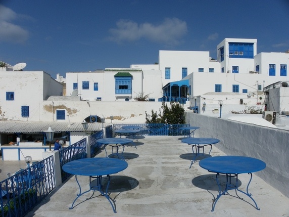 Rest Chargui, 28 TND. Buena comida local, sencilla y barata. Terraza al aire libre de tonos azules y blancos con vistas al pueblo, y al mar por encima de los tejados.