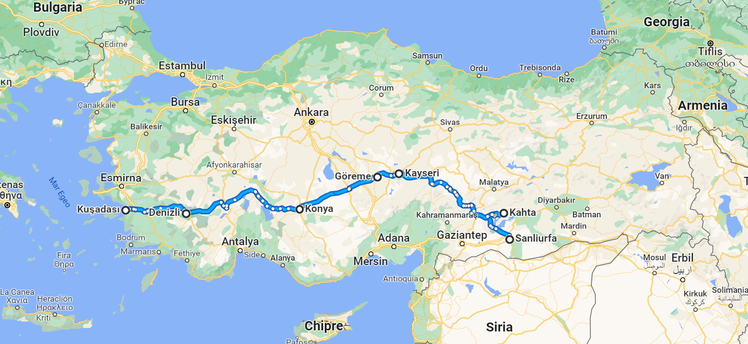En total es un recorrido de unos 1.500 km, que en caso de hacerse en transporte público deberás cubrir en autobús, ya que el tren no se adapta demasiado bien a este recorrido y requiere de desplazamientos más largos. El servicio de autobuses en Turquía es de los mejores del mundo, comparable a Argentina o Chile, autobuses modernos, asientos reclinables 180º, servicio de catering a bordo, pantalla individual con películas y juegos, dos conductores, estaciones con todas las comodidades... pero suele ser lento, pues realiza muchas paradas, las oficiales y las no programadas (cualquiera que levante el brazo en una carretera).
