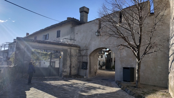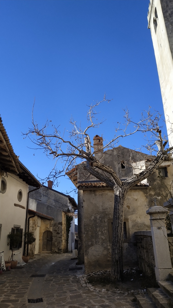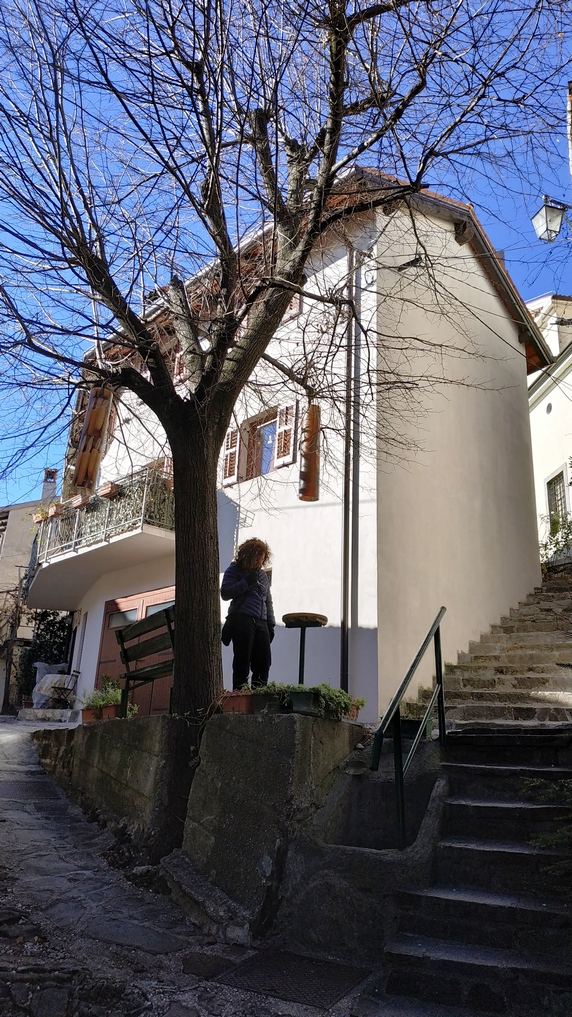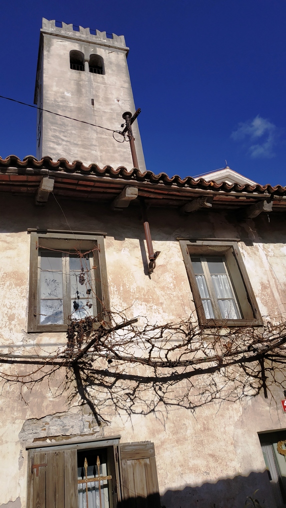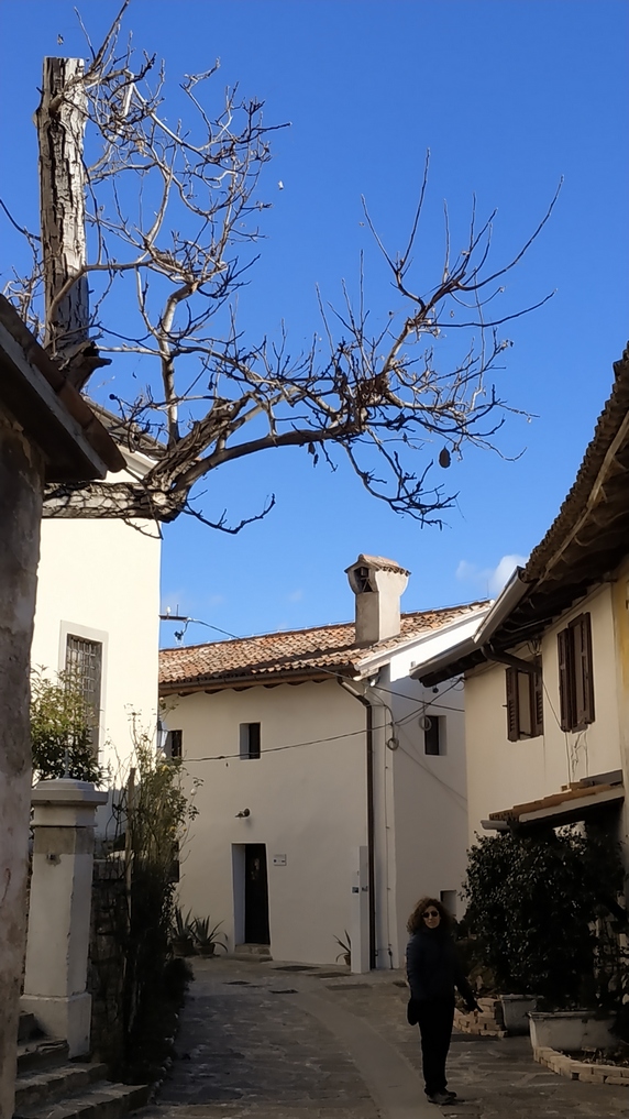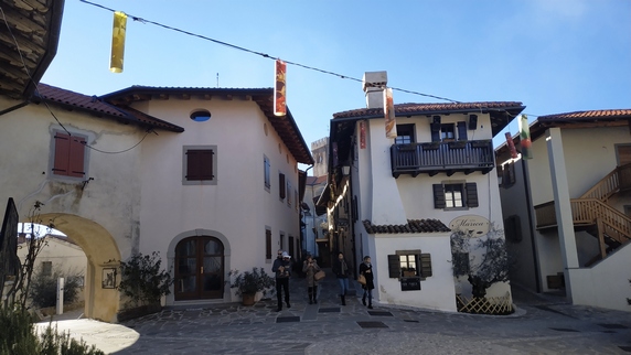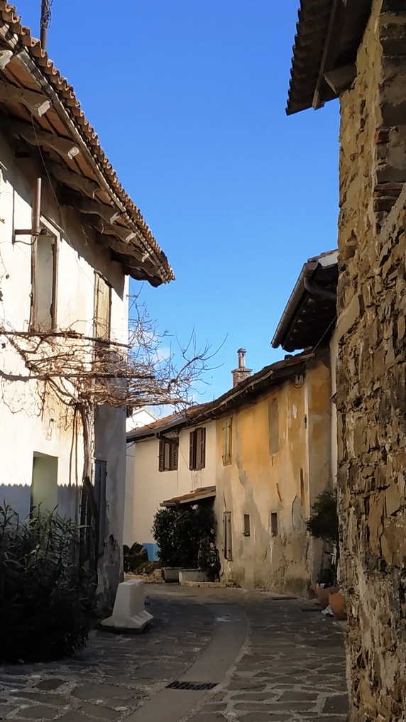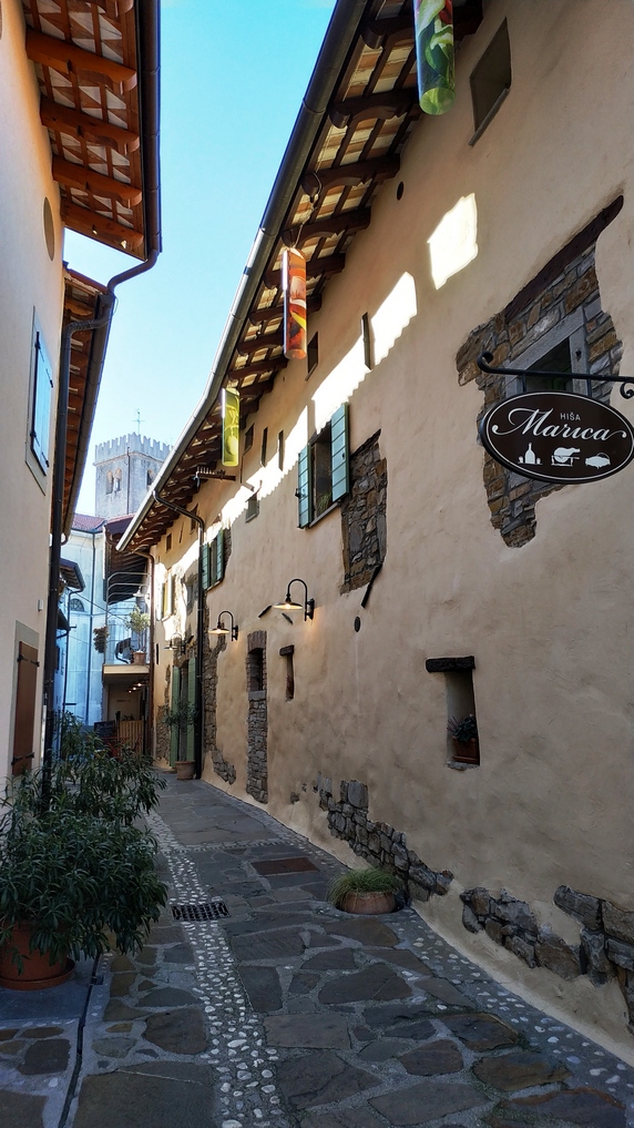 La mayoría de poblaciones que atravesaremos hoy son pequeños pueblos de casas bajas y calles empedradas, donde solo se ve gente paseando por la calle camino de la iglesia (es domingo). Paramos en Vipava a estirar un poco las piernas. Por Ajdovščina pasamos de largo, aunque nos da tiempo a ver las piedras colocadas en los tejados de algunas casas, para cargar las tejas contras los fuertes vientos que soplan en la zona. Seguimos dirección norte, Google Maps nos hace atravesar unos 10 km de territorio italiano, para llegar hasta Dobrovo. El paisaje de viñedos nos acompaña todo el trayecto.