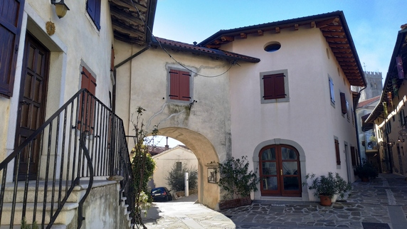 Entre el siglo XVI y la segunda mitad del siglo XVIII, Šmartno fue un importante puesto de defensa estratégica incorporado en el sistema de fortificaciones, utilizadas durante la pugna de los Habsburgo y la República Veneciana. Parece que el asentamiento tenía un puente levadizo frente a la entrada y estaba rodeado por un foso profundo. Hoy en día es un pequeño pueblo amurallado sin castillo, solo hay tres calles paralelas organizadas alrededor de la Iglesia de San Martín y su alto campanario. Entre sus murallas hay algunos cafés y restaurantes, y unas pocas casas que albergan bodegas en la planta baja. Frente a la puerta principal de acceso hay un parking gratuito y un hotel.