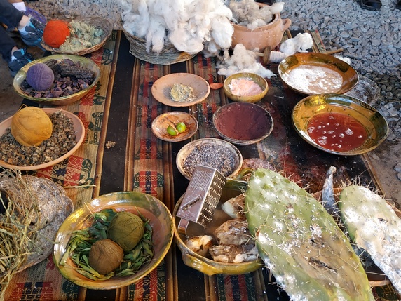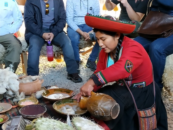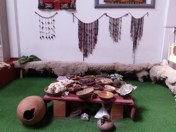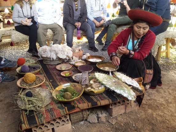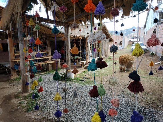 cooperativa textil, donde nos enseñan prendas confeccionadas con lanas de llama y alpaca, y nos explican como consiguen impregnar en el tejido los colores confeccionados a través de diferentes plantas y semillas. La primera parada arqueológica es el
