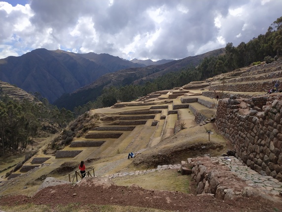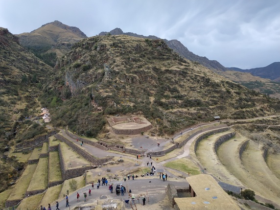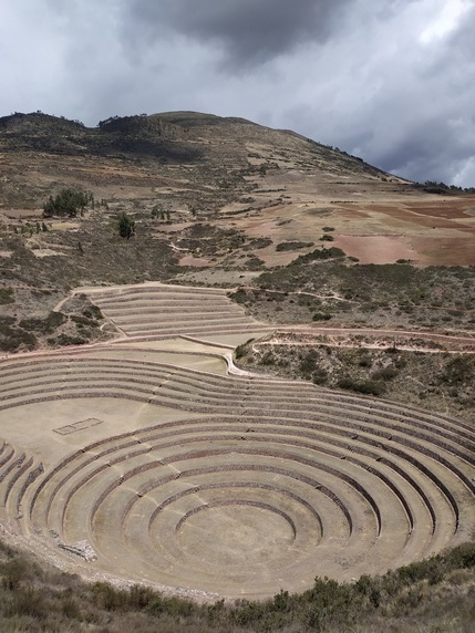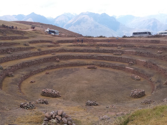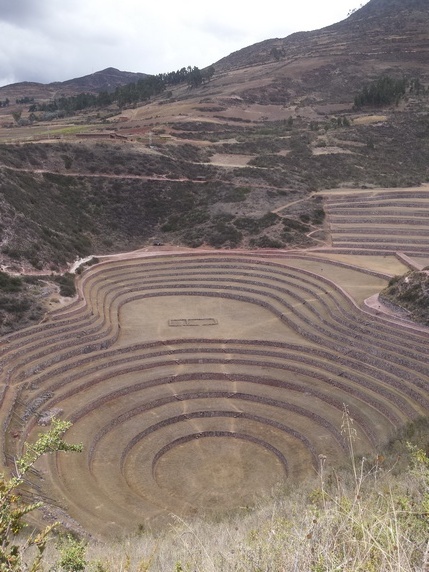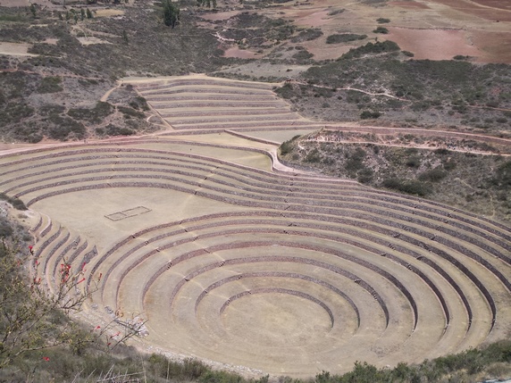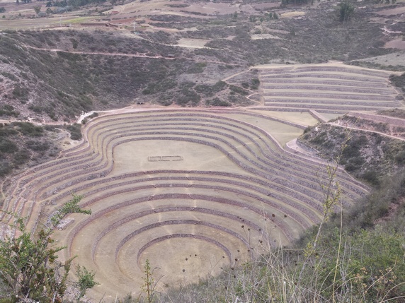 conjunto arqueológico de Moray, un lugar con terrazas de cultivo circulares, tan perfectas que más bien parecen anfiteatros, a las que los pobladores llaman “muyus”. La galería mayor tiene una profundidad de 45 mts y el promedio de altura de cada andén (terraza de cultivo) es de 1,80 mts. Su diseño, profundidad, variedad de tamaño y posición en relación al sol y al viento parecen indicar que Moray fue un importante centro de investigación agrícola para la domesticación, aclimatación e hibridación de especies silvestres que se adaptaron para el consumo humano. Cada terraza tiene su propio microclima, una por cada tipo de cultivo que plantaban los incas. Con una variación de 15ºC entre el bancal superior y el inferior, y muestras de suelo traídas desde diferentes lugares, es probable que los incas investigaran en este laboratorio agrícola las condiciones óptimas para cada cultivo.