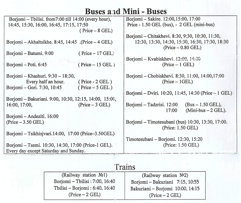 marshrutka que que viene de Akhaltsikhe y pasa por Borjomi a las 20:00. Pedir en el Centro de Información que os compren el billete por teléfono.