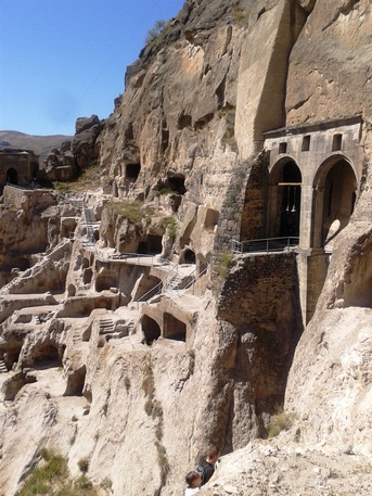 Vardzia, 3 GEL. Durante la segunda mitad del siglo XII, la reina Tamar construyo un monasterio que poco a poco fue extendiéndose creando un gran complejo de cuevas y túneles excavados en la roca de un acantilado sobre el río Mtkvari, que se extienden por mas de 500 mts. Llegaron a vivir hasta 2.000 monjes, poseía más de seis mil estancias distribuidas en trece pisos, así como una iglesia, un salón del trono y un sistema de riego para cultivos en terrazas.