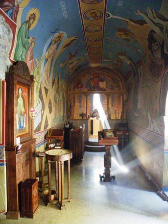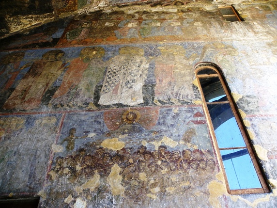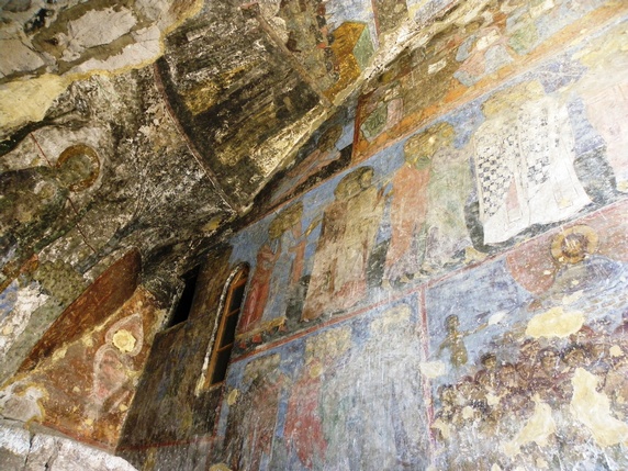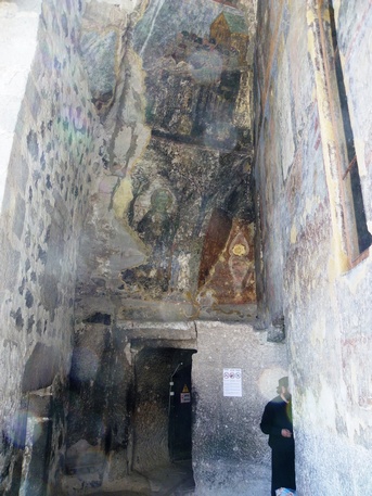 Están en plena oración. El monasterio data del siglo IX. En el siglo XVI fue atacado y destruido, y todos sus monjes asesinados. Dicen que las manchas de sangre todavía pueden verse en las rocas que rodean la fuente cercana al monasterio. Nos conforma- mos con admirar sus bellos murales. |