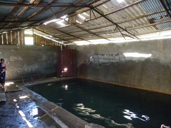 piscina de aguas termales que hay a pocos metros del complejo de Vardzia. El agua a 41º de temperatura es conducida por tuberías hasta una pequeña piscina de 10x4 mts escondida bajo un cobertizo cochambroso. No hay sitio donde cambiarse, lo hacemos en la caseta del guarda, ni duchas de agua dulce para quitarse el olor a azufre. Pero el baño es súper relajante y la experiencia muy divertida para todos. Acceso 3 GEL.