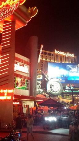 Boulevard (la Strip) es una larga avenida de 6 km llena de casinos y hoteles, uno junto al otro como casas adosadas, que hacen lo imposible por atraer la atención del cliente, con fastuosos y llamativos edificios que reproducen otras épocas o lugares, miles de vatios en neones, grandiosos espectáculos gratuitos, y de pago (Cirque du Soleil tiene ocho shows), alcohol en las calles, tabaco en el interior de edificios, y todo ello abierto 24h al día 365 días al año.