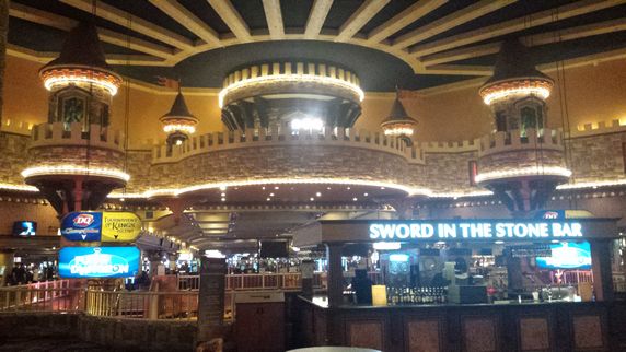 Excalibur es un castillo con almenas y torres coloreadas, como si fuera de juguete; el