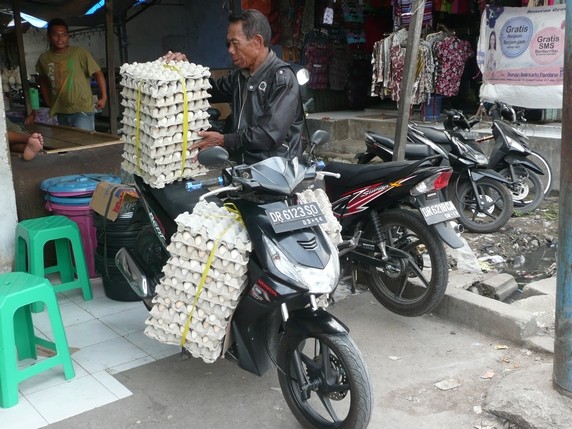 12:30 Llegamos a la estación de autobuses de Mataram, donde cogeremos un autobús mas grande para atravesar Lombok y Sumbawa. Un autocar cómodo y moderno, nos dijo quien nos vendió el billete. No le creímos, pero esperábamos algo mejor. Los asientos reclinables están rotos, la distancia entre ellos no es homogénea y en algunos casos es extremadamente corta, ni que decir tiene que el aire acondicionado no funciona, la puerta del lavabo no se abre, y además durante el trayecto va haciendo paradas que llenan el pasillo y los asientos vacíos de todo tipo de mercancía, comida incluida aunque no animales.