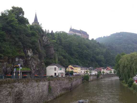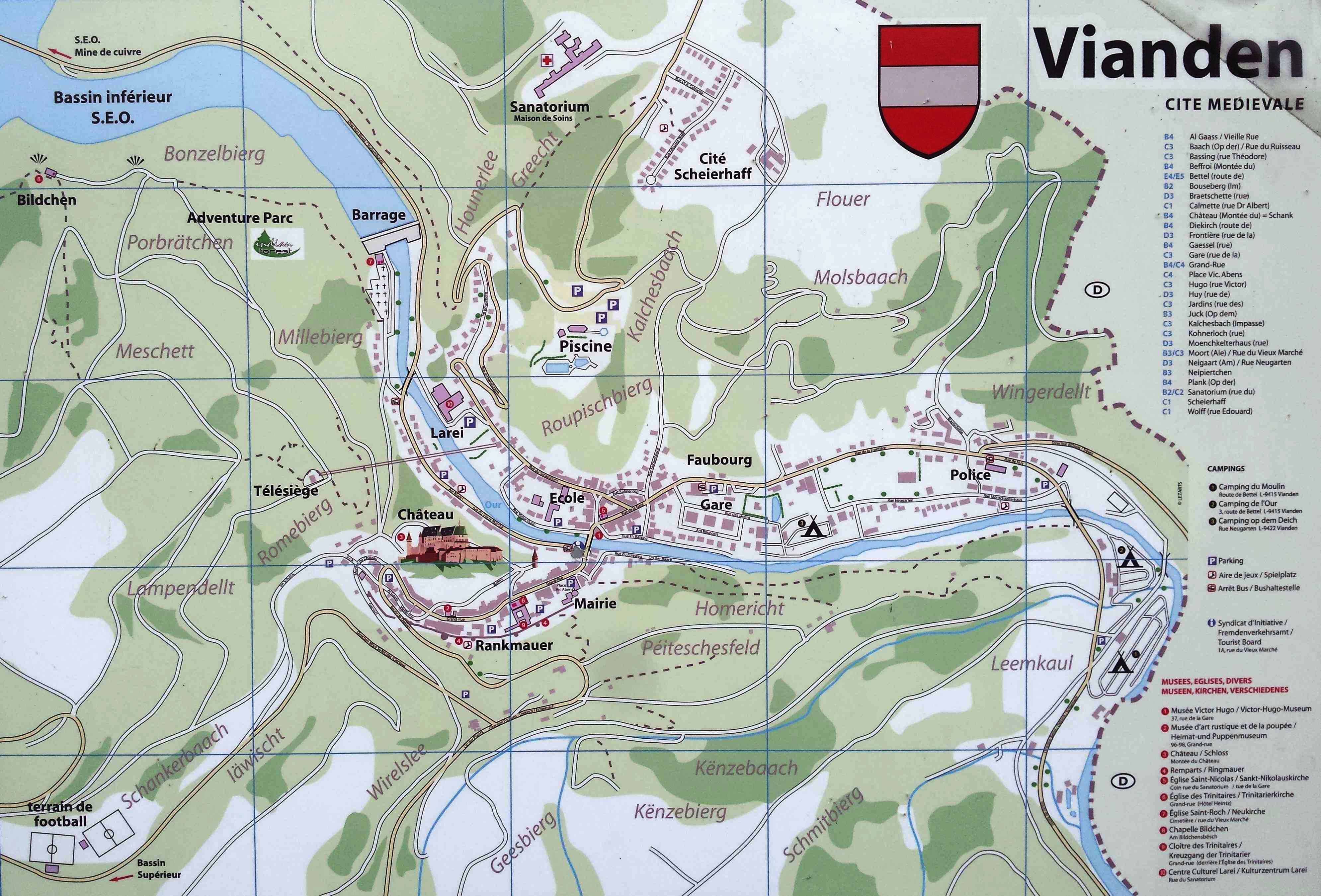 Vianden es una pequeña población de unos 1.500 habitantes situada en el fondo del valle que forma el río Our. Durante la edad media sus artesanos destacaron como orfebres, cerrajeros, albañiles, curtidores y tejedores, siendo el tintado de cuero extraído de cerdos criados localmente, su principal industria hasta mediados del siglo XX. Es un pequeño pueblo de calles empedradas y casas de colores pastel con tejados de pizarra, con numerosos atractivos, como la iglesia parroquial construida en estilo gótico en 1248, el Museo de Arte Popular ubicado en una antigua mansión, o el