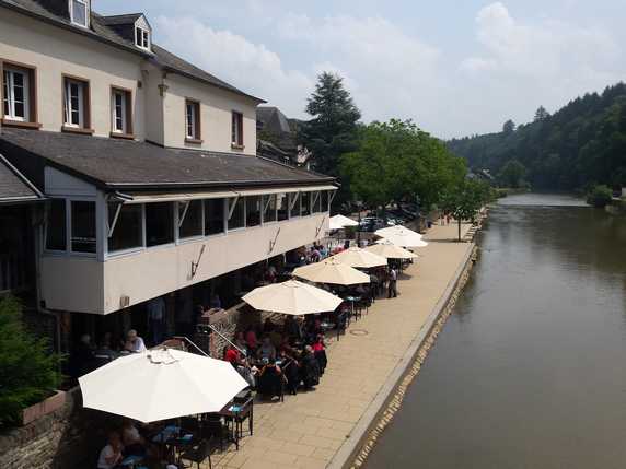 En los márgenes del río y la Grand Rue, calle principal del casco antiguo que va desde el puente sobre el río Our hasta el castillo, abundan los hoteles, bares y restaurantes con ofertas para comer desde 12€ el menú. Nosotros nos sentamos en la terraza del
