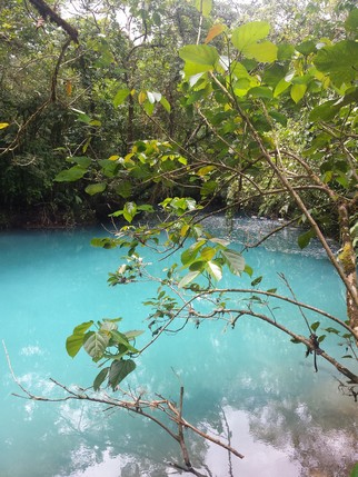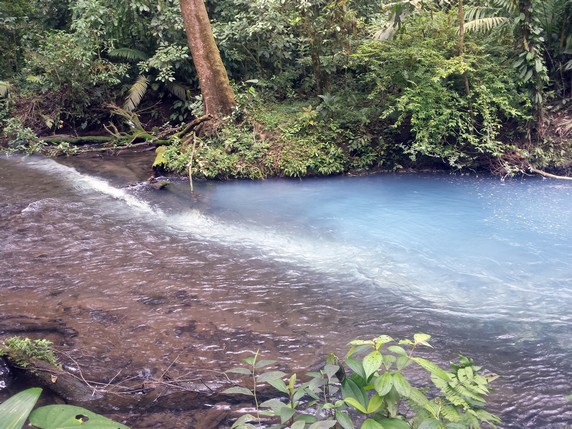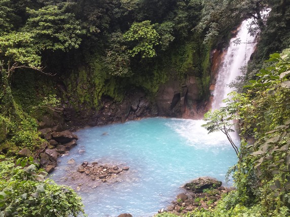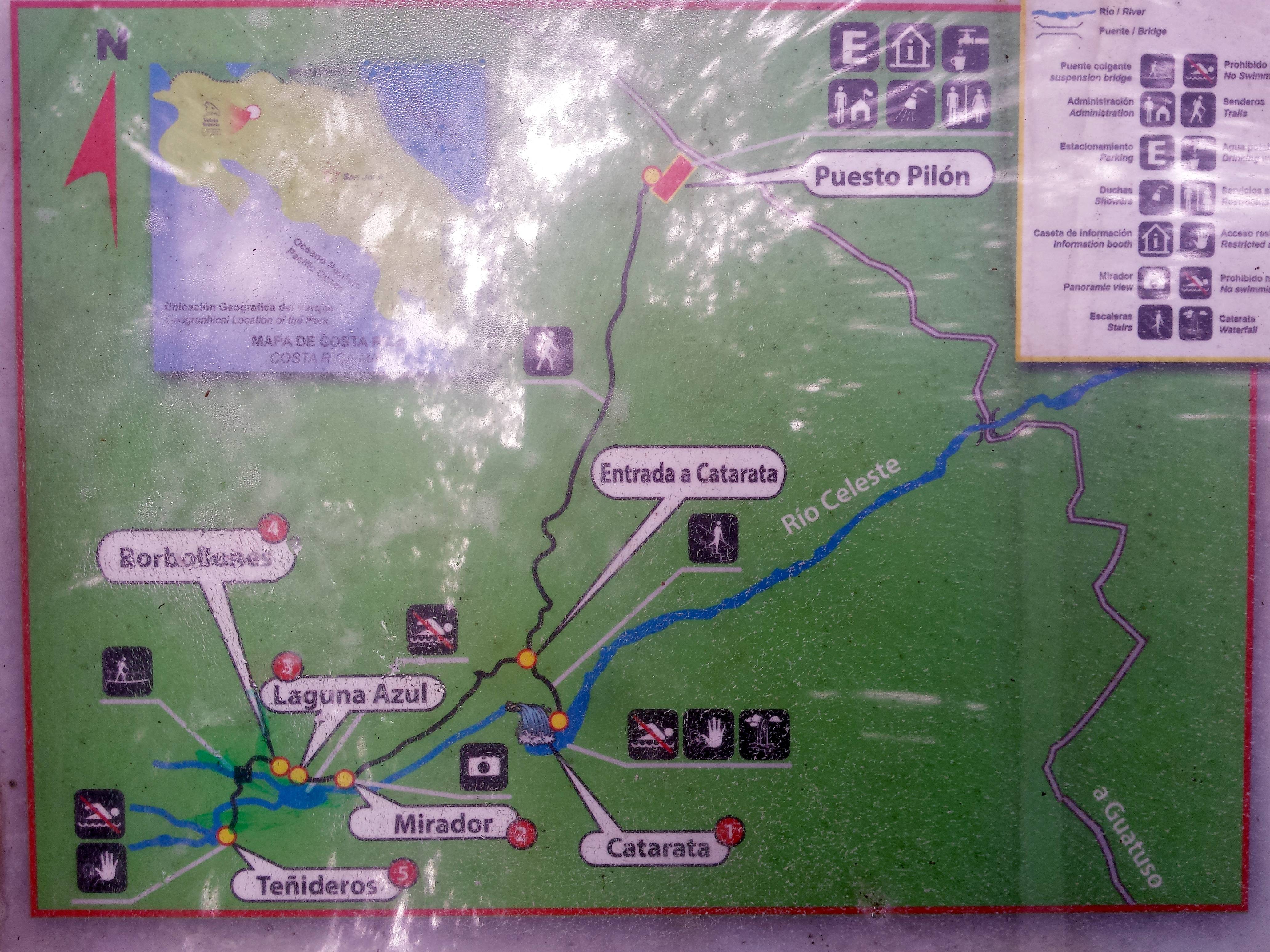 Catarata del río Celeste, de unos 30 mts de altura. Los escalones acaban en un mirador desde el que poder admirar la caída de agua y la poza que forma a sus pies. Está prohibido el baño. Para volver al sendero principal hay que subir de nuevo la larga escalinata. Después el camino sube constante hasta el punto más alto del sendero, un pequeño mirador con vistas sobre el volcán Tenorio y el monte Montezuma. En seguida, vienen la Laguna Azul y Borbollones, y después Teñideros, lugar donde acaba el sendero. Para entender mejor el significado de estos lugares explicare la historia siguiendo el curso del río.