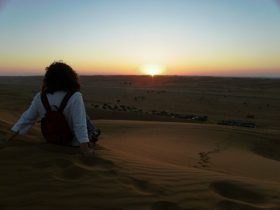 Una excursión en jeep (10 rials) nos adentra en el desierto. Subiendo y bajando dunas, algunas desde el asiento de copiloto se ven realmente grandes cuando el morro enfila hacia abajo. Paseamos sobre la loma de una duna. La arena es finísima. Cualquier movimiento brusco o intento de correr hunde un palmo los tobillos. Ningún atisbo de vida mas que algunos camellos a lo lejos. El jeep nos deja en una duna tras el campamento, desde donde contemplamos una espectacular la puesta de sol.