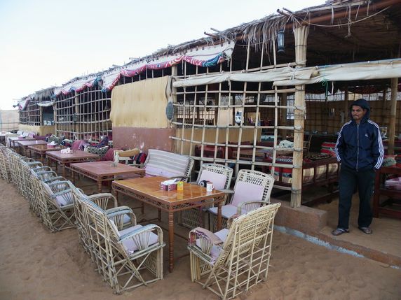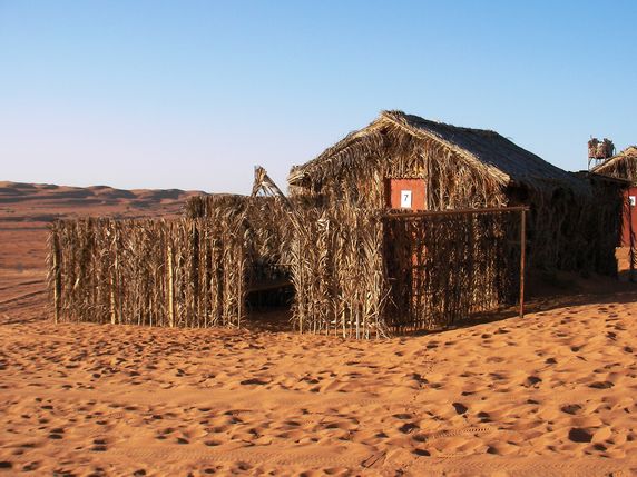 Al Areesh Desert Camp. 25 rials pp, incluye desayuno y cena, además barra libre de té, café y dátiles durante todo el día. Consta de una cincuentena de cabañas cubiertas con hojas de palma distribuidas alrededor de un enorme comedor que dispone de una relajante área con cojines y alfombras, y una terraza perfectamente orientada para ver la puesta del sol. Nuestra cabaña dispone de dos habitaciones con tres camas individuales y una doble, y un anexo con baño completo. No hay agua caliente ni toallas. Austera y simple, cuenta con un enchufe y un par de mantas para combatir las frías noches. Organizan excursiones en jeep por el desierto (1h/3h 10/30 rials por vehículo) y salidas en camello (10 rials 1h). También existe la opción de contratar un guía si lleváis vuestro propio vehículo. Cena incluida: bufet libre bueno y generoso (ensalada, dahl, humus, smashed patatas, pita, arroz, verduras, carne, pollo, patatas fritas y refrescos). Tienen cerveza (2 rials). ¿Que mas se puede pedir?