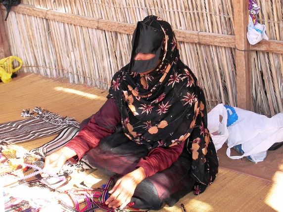 entrada del campamento unas mujeres beduinas venden abalorios bajo