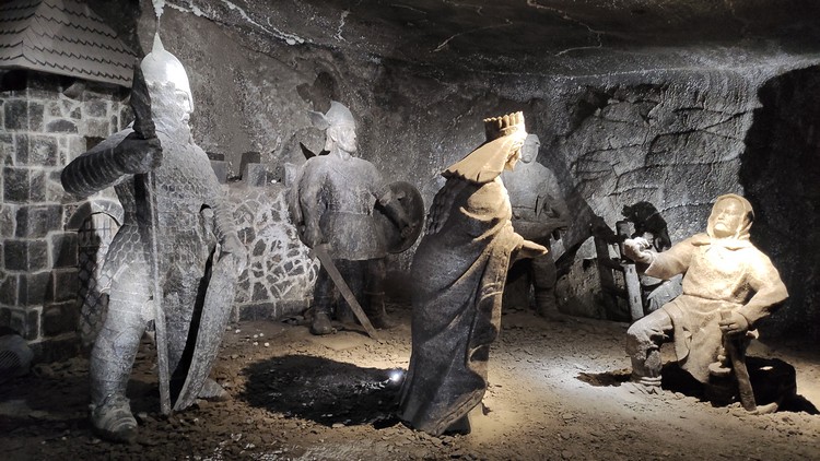 El recorrido turístico baja hasta los 125 mts y recorre unos 3,5 km, donde se suceden más de una veintena de galerías. La mayoría contienen estatuas de personajes míticos e históricos, esculpidas en la roca de sal por los mineros. También hay cámaras y capillas excavadas en la sal o candelabros con sus cristales esculpidos en sal. Se atraviesa un lago subterráneo que ofrece bonitas tonalidades de verdes y azules agudizados por el efecto de la sal. Es una visita interesante y sorprendente. La visita a la Capilla de St. Kinga, por ejemplo, es una impresionante sala de 54 metros de longitud profusamente decorada a base de sal, estatuas de la Virgen y Juan Pablo II, cuadros de la última Cena.
