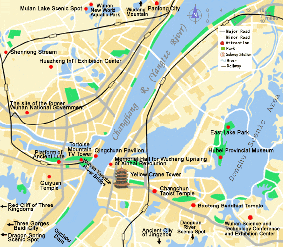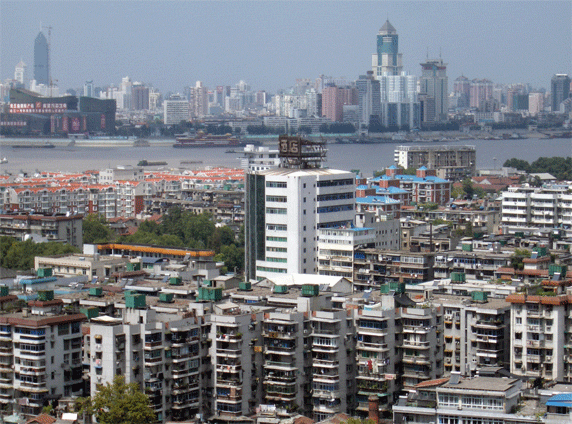 Wuhan. (7.200.000 hab.) Es una ciudad grande, moderna e industrial. Es en realidad la unión de tres ciudades (Wuhan, Hankou y Hanyang) separadas por los ríos Yangzi y Han. Durante siglos, la ciudad ha sido el centro del comercio y del transporte en China central. Hankou fue durante la dinastía Qing una de las ciudades más importantes del país. Desde aquí los comerciantes usaban el río Yangtze para ampliar sus negocios por toda China.