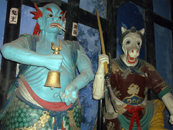 . La leyenda se remonta a la dinastía Han cuando dos oficiales, Yin Changsheng y Wang Fangping, se recluyeron aquí como monjes taoístas alcanzando más tarde la inmortalidad. Durante la dinastía Tang, unieron sus dos apellidos Yin-Wang, que significa "Rey del Infierno". Desde entonces más de 70 templos llenos de estatuas representando demonios terroríficos y amenazantes se han construido en la zona, que ahora se conoce como la Ciudad Fantasma.