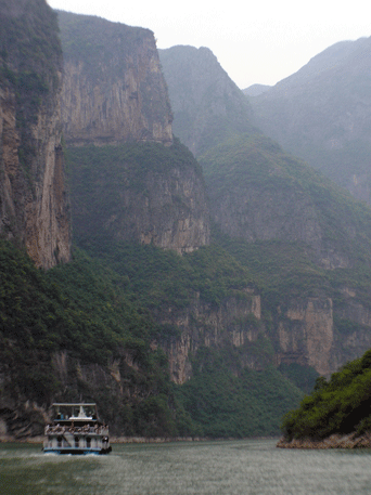 Llegamos a la primera garganta, Qutang, la más corta con 8 km de longitud. Los primeros acantilados tienen 350 metros de altura, y la anchura del río es descomunal, haciendo que un barco de tres plantas y más de 300 pasajeros parezca un patito de goma en una bañera. Durante el trayecto se pueden ver escrituras talladas en las paredes, algunas de ellas de la dinastía Song, y ataúdes de los antiguo Ba en lo alto de algunos acantilados.