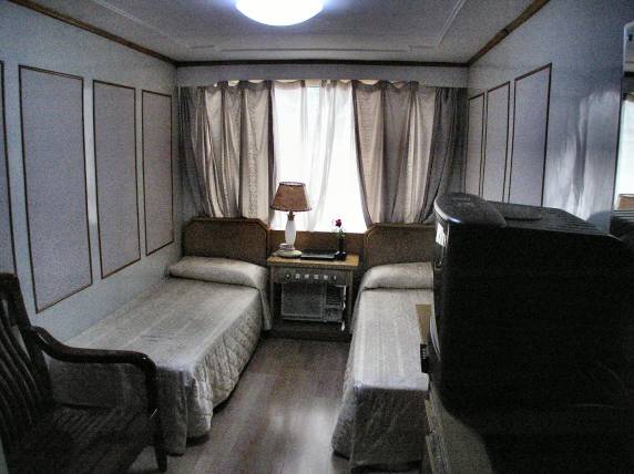 . Primera clase, dos camas de 180 cm, mesita de noche, aire acondicionado, lavabo completo y banco-sofa. En el restaurante se puede comer por unos 30