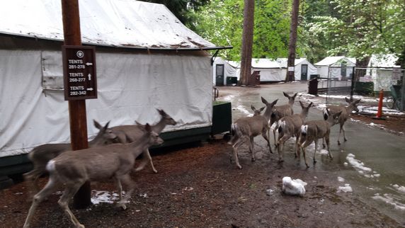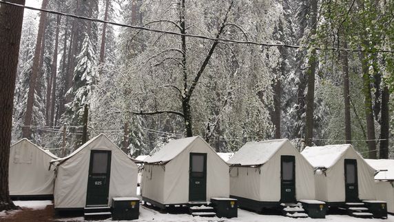 Curry Village una tienda sin calefacción por 80$ la noche. Son tiendas grandes con cama, toallas, mantas y caja antiosos para guardar de forma hermética la comida y cualquier cosa que despida un olor que pueda atraerlos. El coche se deja en un parquing a un centenar de metros.