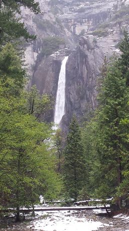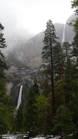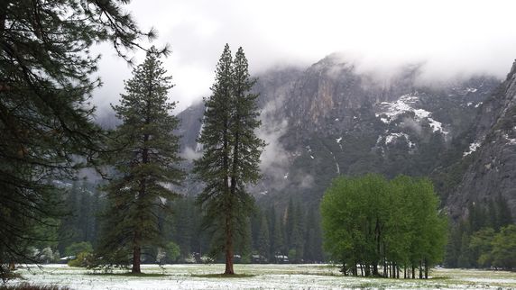 Ha estado nevando toda la noche y hasta casi las 10:00 de la mañana, que se ha puesto a llover hasta las 17:00. Así que no ha sido un gran día para el turismo, aunque lo hemos intentado. En una tienda junto al Centro de Visitantes compramos un buen calzado para lluvia y nieve por 80$, el nuestro estaba viejo y deteriorado, y llevamos toda la mañana con los pies mojados. Aunque todavía llueve nos animamos a caminar ahora que sabemos que tendremos los pies secos. En el Centro de Visitantes nos sugieren un pequeño loop que permite ver los picos de El Capitan y Eagle Peak, las cascadas de Yosemite Fall y Bridalveil Fall, Sentinel Beach y un par de puentes sobre el río Merced. Algunos de estos puntos enlazan con senderos, así que el paseo puede ser tan largo y exigente como tú quieras. No parece un mal plan para un día soleado, pero cansados de tanta lluvia, a media tarde cogemos el coche. Llegamos hasta Tunnel View justo a la salida, desde donde hay muy buenas vistas del valle.