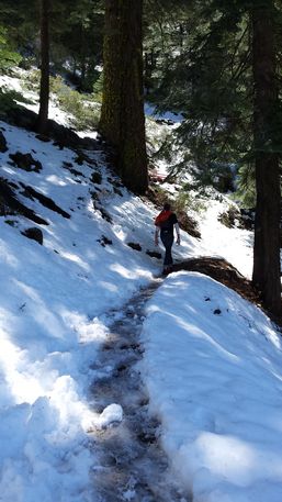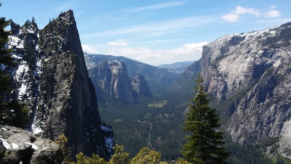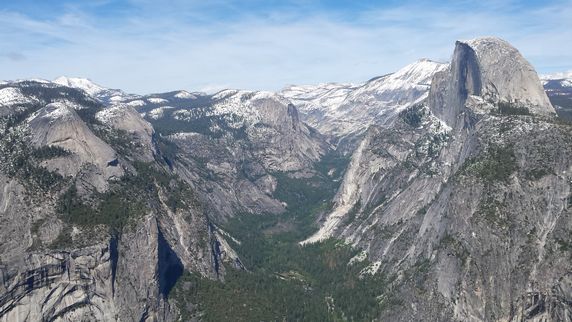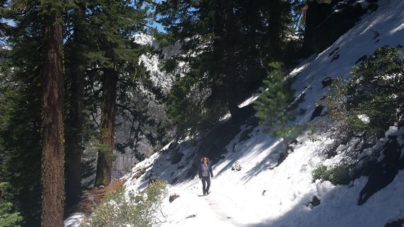 Four Mile Trail, un sendero que asciende los 980 mts de desnivel en 7,7 km, una caminata de 15 km ida y vuelta. En total empleamos 6h30, 3h en subir, 1h arriba comiendo y descansando, y otras 2h30 bajando. El primer tercio está semi asfaltado y seco, aunque es el más empinado de todos. Hay fantásticas vistas de El Capitán y las cataratas de Yosemite, así como del río Merced que cruza el valle. En el segundo tercio empieza a aparecer la nieve en el camino, que hasta entonces solo habíamos visto en los márgenes. Hay varios tramos con buenas vistas de Half Dome y Tenaya Canyon. En el último tramo la nieve lo cubre todo, y el hielo en muchas partes lo hace resbaladizo. Desde la cumbre hay vistas espectaculares del valle con la cordillera al fondo, incluyendo las cataratas de Yosemite, Vernal Fall y Nevada Fall, y las picos de Half Dome y Clouds Rest.