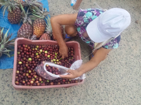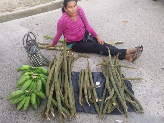 suri, gusanos de escarabajo, del tamaño de un dedo gordo, que viven en la palmera aguaje. Tres gusanos fritos dos soles, también pueden comerse vivos, pero la verdad, ya me parece demasiado. 1kg de mandarinas 3 soles, plátano a la brasa relleno con queso 1,5 soles, una piña 1 sol, un manojo de plátanos 2 soles. Transporte al mercado en mototaxi dos soles por trayecto.