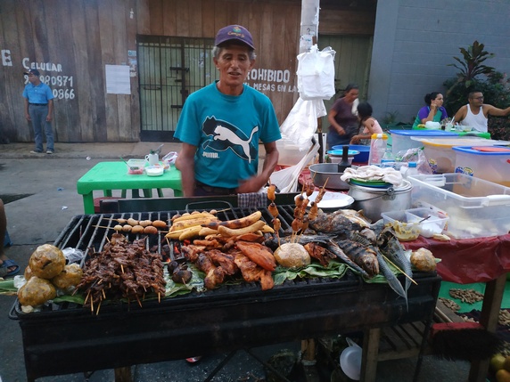 wifi. Para comer en la zona hay media docena de restaurantes con menús a 6 soles, o también algunas familias que sacan las parrillas a la puerta de casa y venden lo cocinado por 4-5 soles. Frente al hotel hay una tienda de abastos y un pequeño mercadillo con ropa y productos para el hogar. Cenamos en una barbacoa familiar juanes y arroz con pollo envuelto en hoja, 9 soles los dos, una cerveza 6 soles y un helado 5 soles.