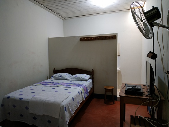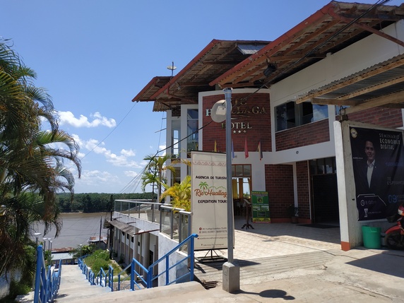 Hotel Rio Huallaga, 150 soles. A dos minutos de la Plaza de Armas. Habitación doble sin ventilador ni aire acondicionado, terraza y baño privado. Hay piscina y restaurante en la azotea, desde donde hay buenas vistas del rio. La atención al público es excelente. Son los dueños de Turismo Selva, la agencia con la que contratamos nuestra visita al Amazonas. Nos dan una extensa y detallada explicación sobre cómo será el tour, mostrándonos fotos y mapas, y respondiendo a nuestras dudas y preguntas.