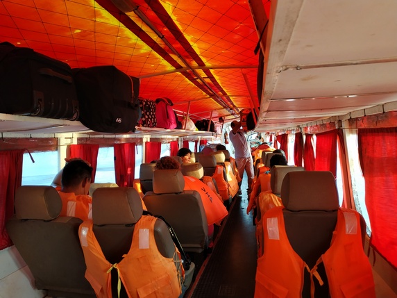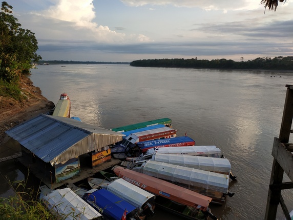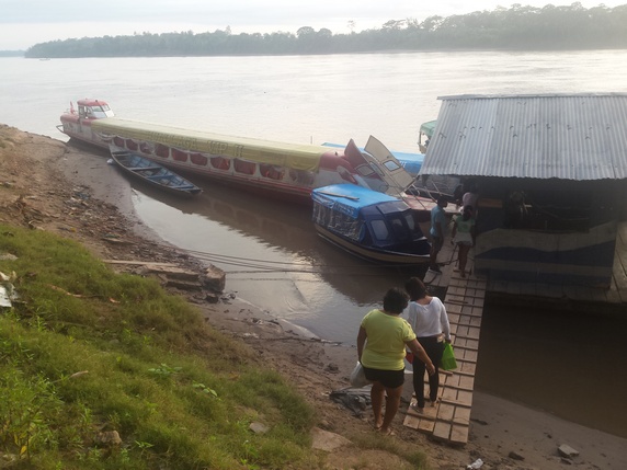 Huallaga Vip, las lanchas rápidas que en un viaje de 4h sin escalas nos llevaran hasta Lagunas, 40 soles. En la barcaza caben unas 40 personas, hay salvavidas en cada asiento, que no son incomodos, pero la música está demasiado alta. Incluido en el precio hay un bocadillo caliente y un zumo de guache (fruta roja con piel de escamas de serpiente típico de la región). Mientras esperamos, sale a las 6h30 pero estamos allí media hora antes, ofrecen gratuitamente café y galletas.